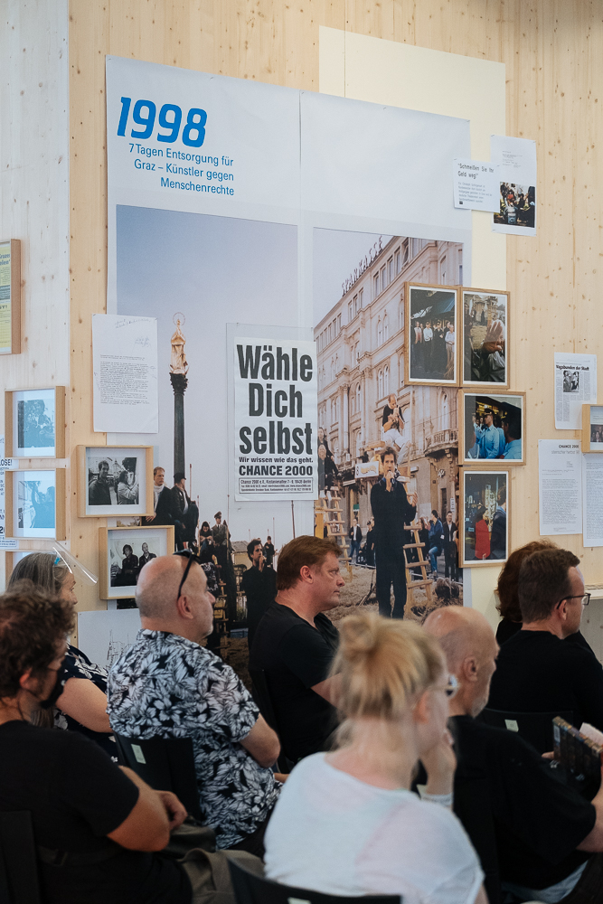 Gespräch mit Christine Frisinghelli (Intendantin steirischer herbst, 1996-1999), Werner Krause (freier Journalist), Claus Philipp (Autor/Dramaturg), Franz Solar (Schauspieler).